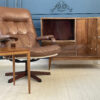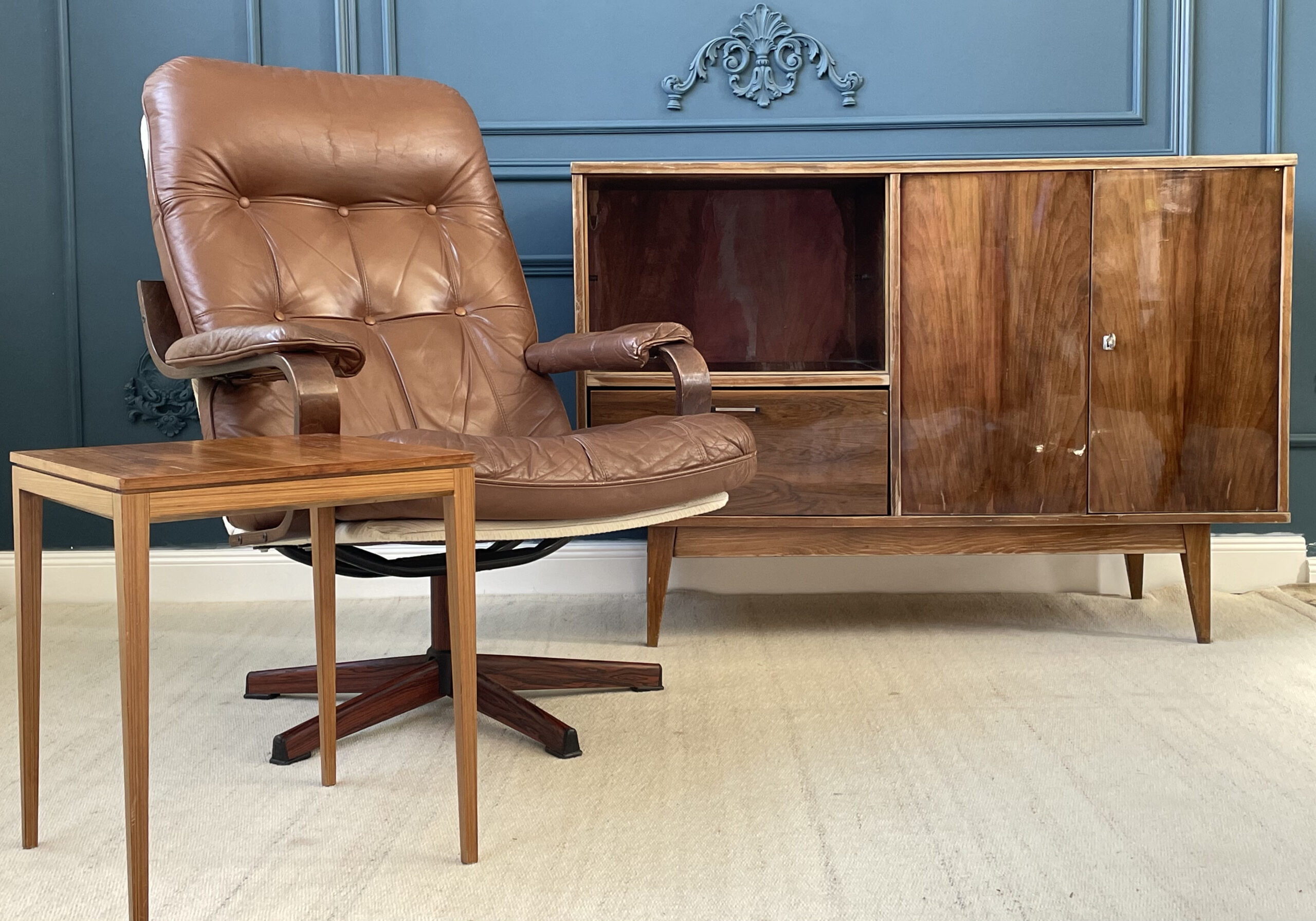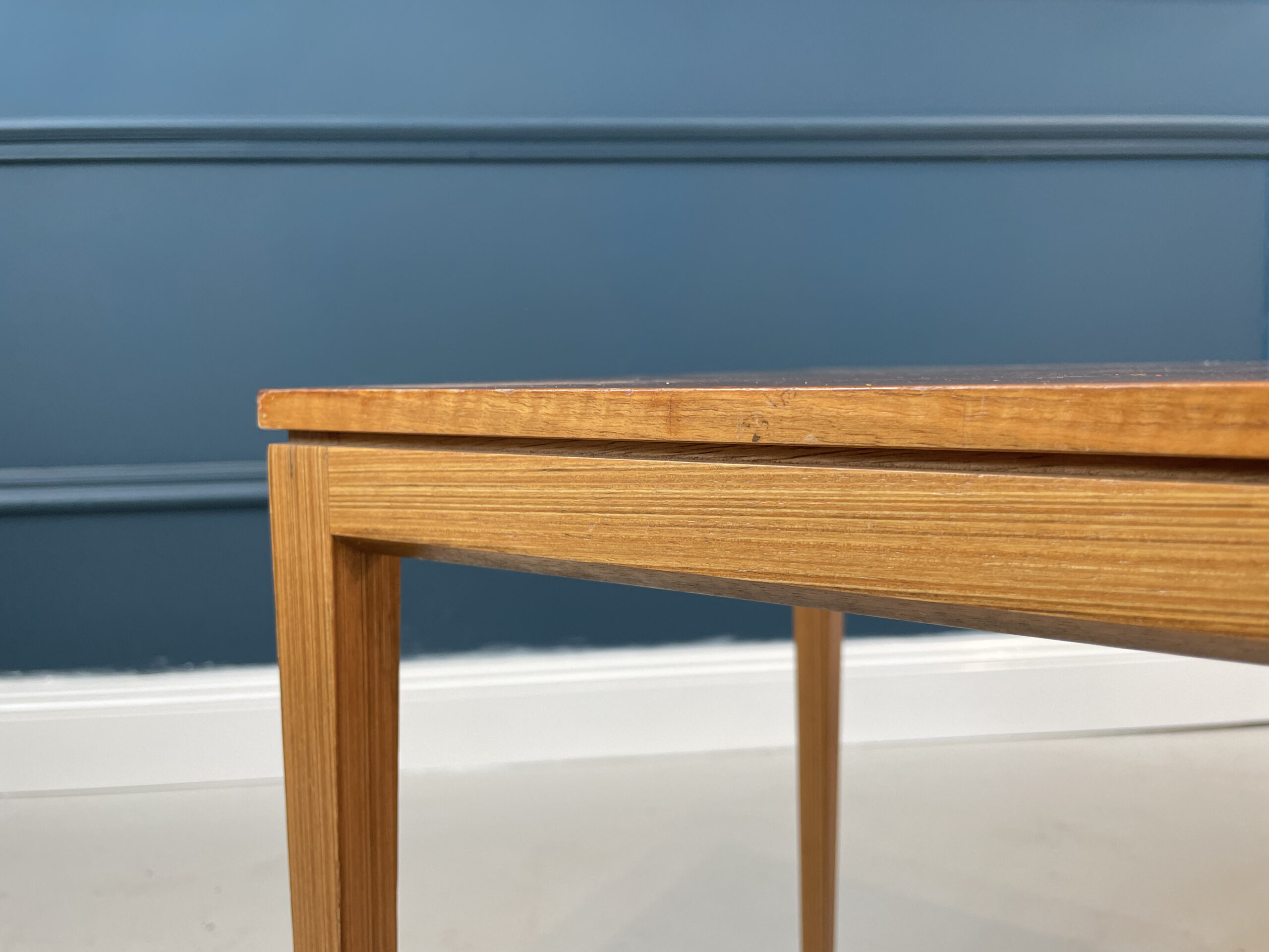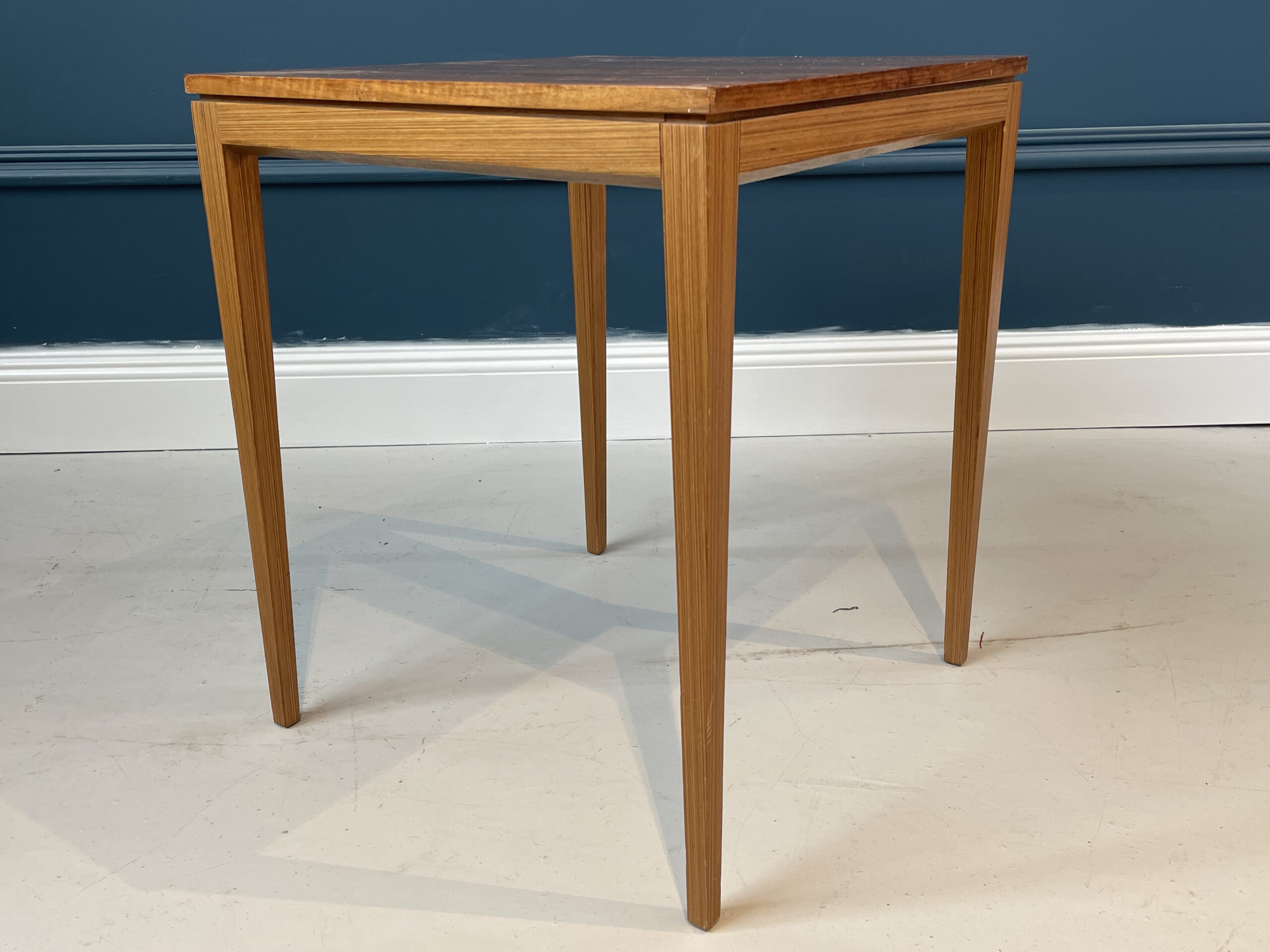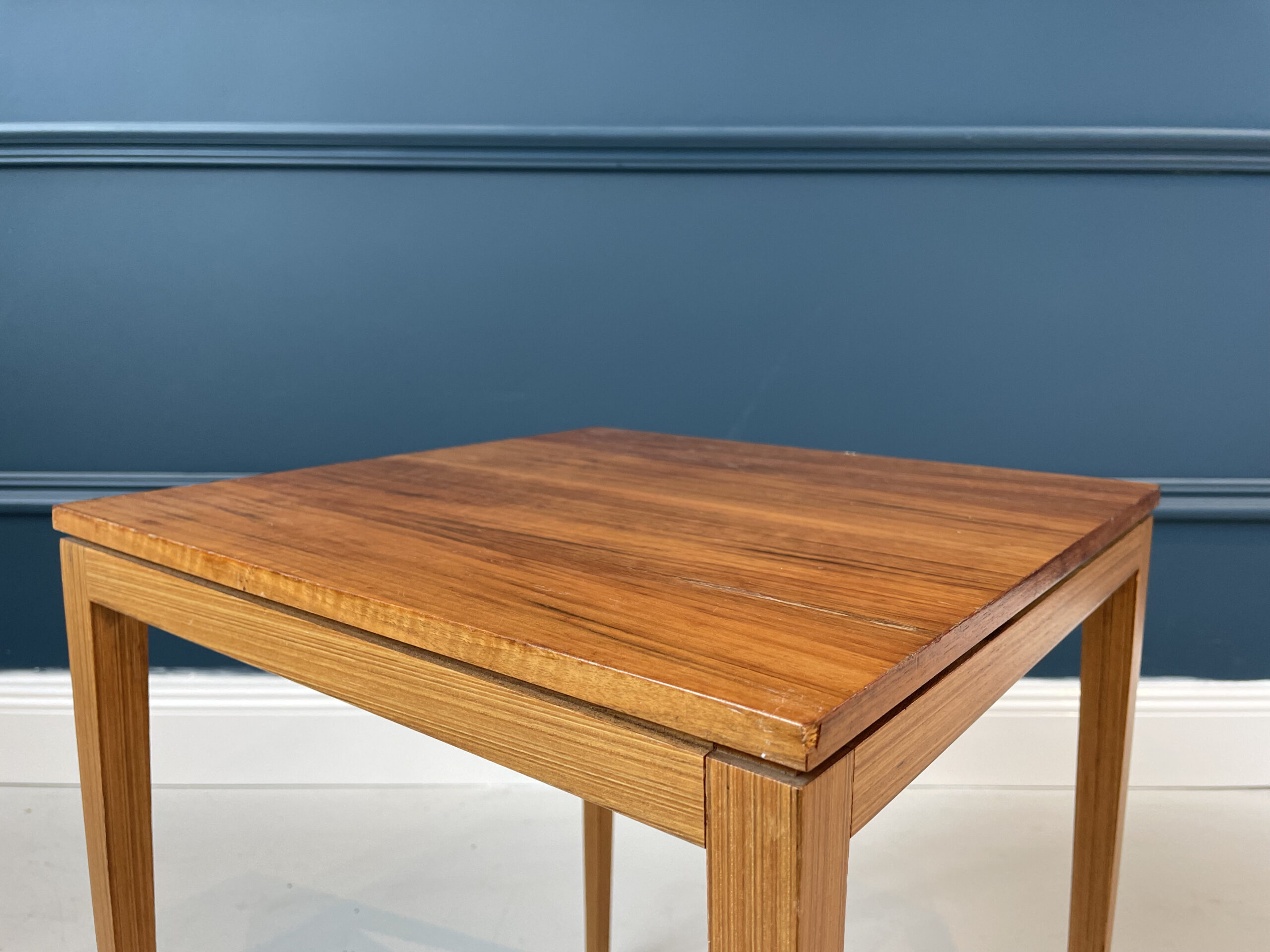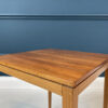 70-ųjų stiliaus kvadratinis staliukas, pagamintas iš rudos medienos. Turi stabilias kojas, yra lengvai transportuojamas.