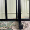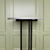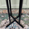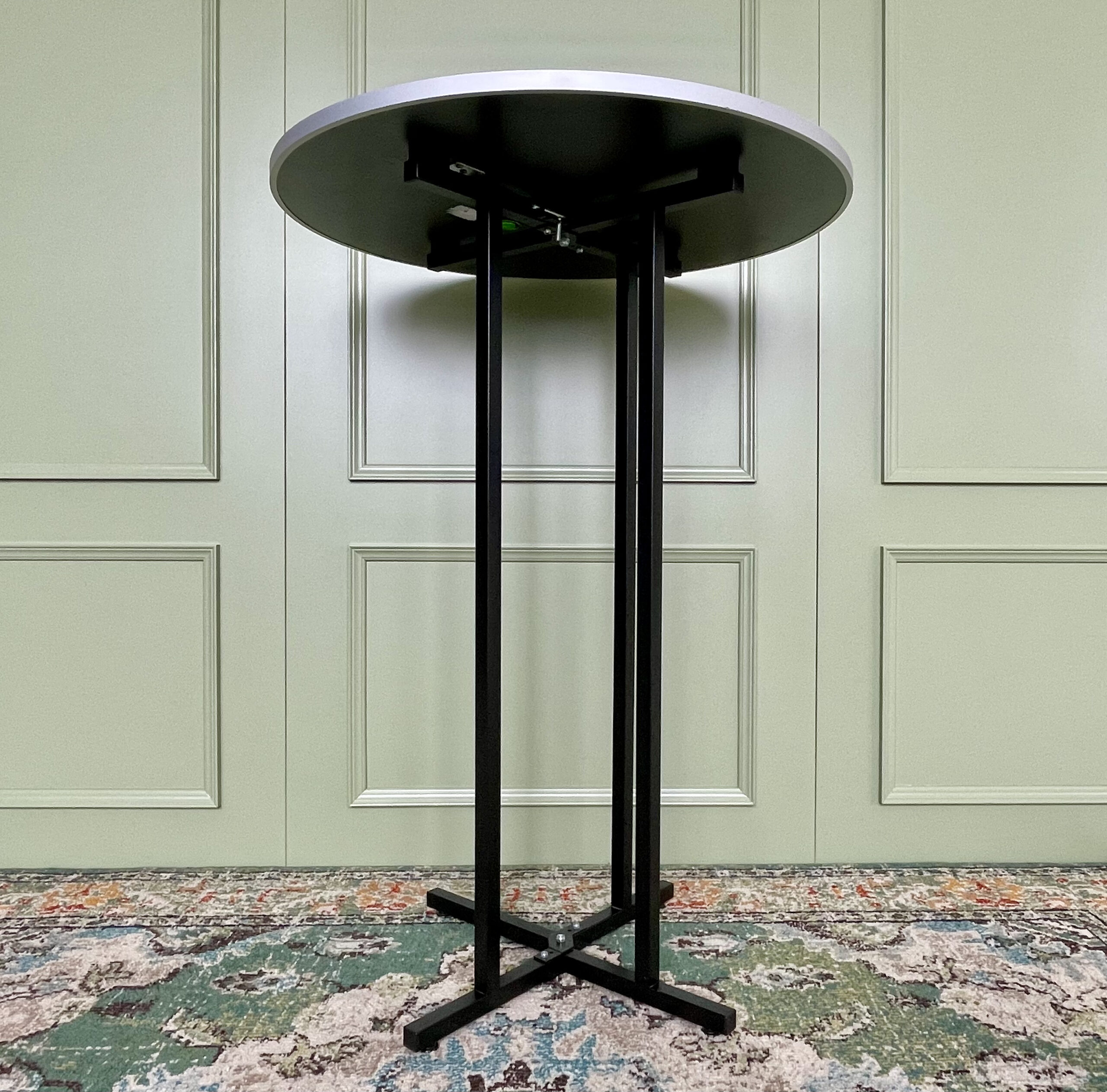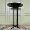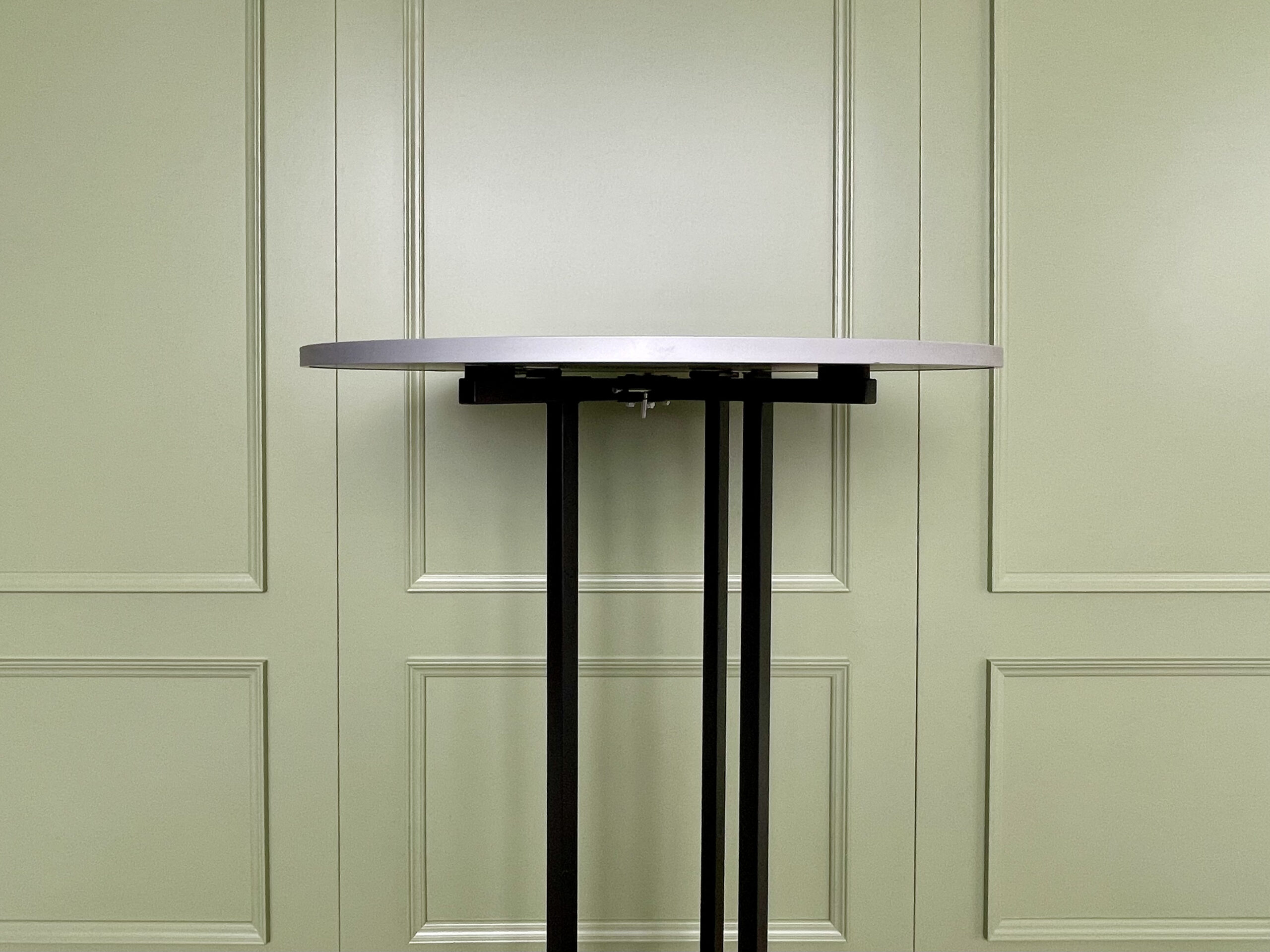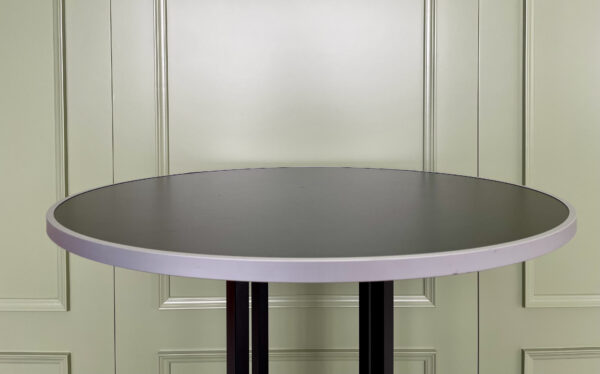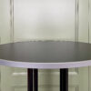 Juodas barinio tipo stalas su stipriomis metalinėmis kojėmis. Stalo viršus apskritimo formos.