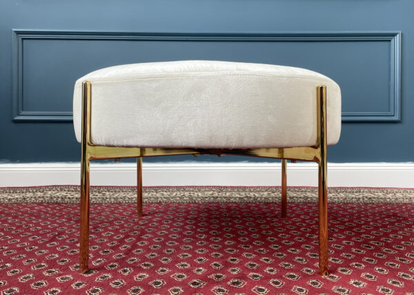 Modernaus stiliaus, patogus ir minkštas apvalus pufas, aptrauktas kokybišku baltu audiniu. Metalinės kojos suteikia pufui itin gerą stabilumą.