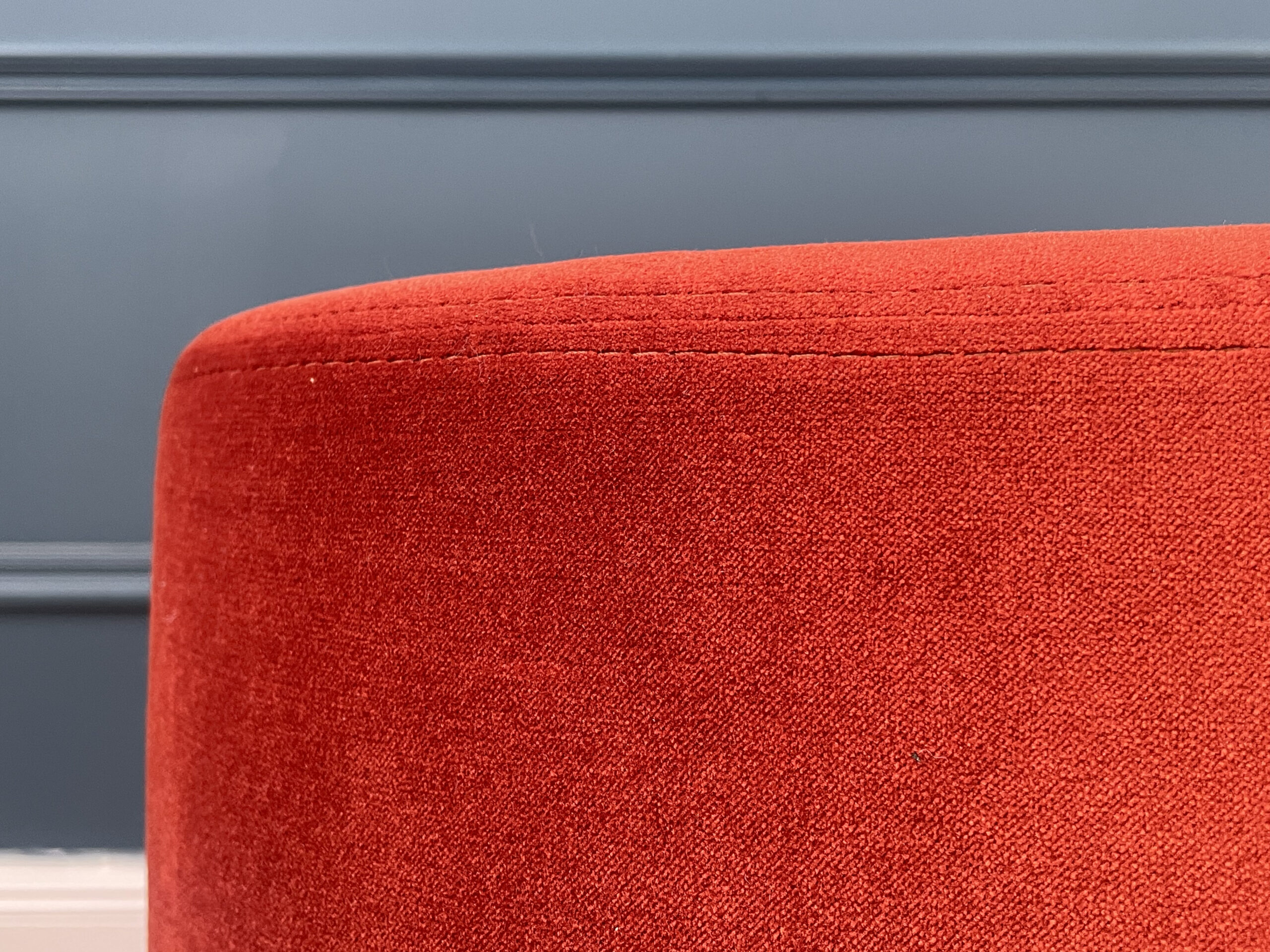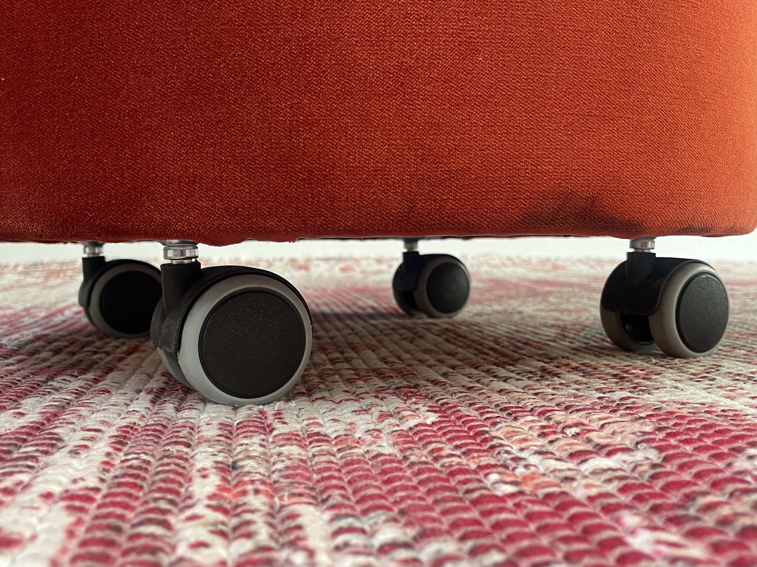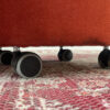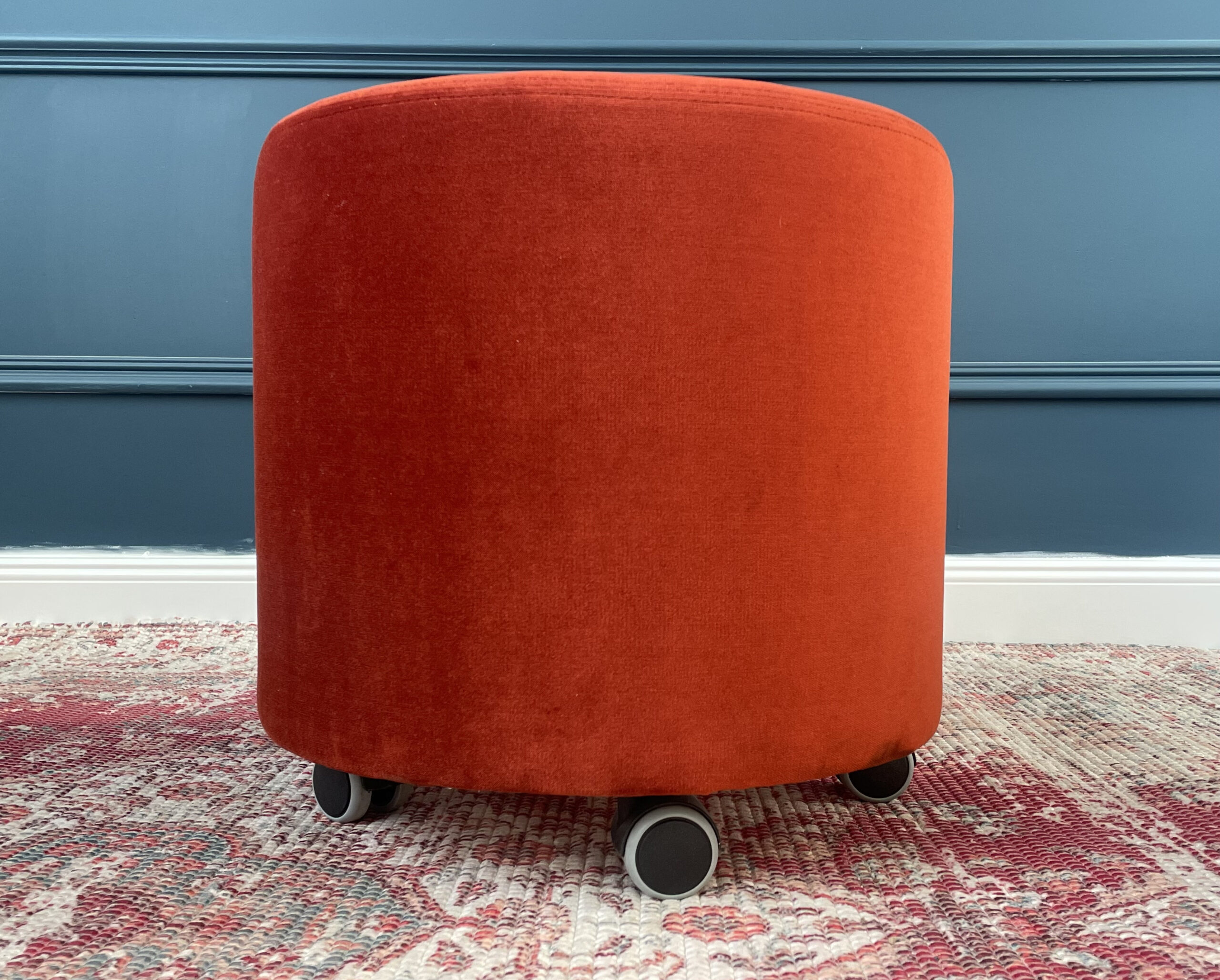 Apvalios formos pufas, su 4 ratukais. Pufas aptrauktas minkštu orandžiniu aksominiu audiniu, kuris leidžia patogiau sėdėti ant jo.