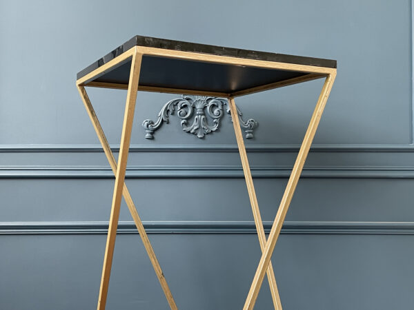 Barinio tipo staliukas, turintis juodą, blizgų stalviršį. Staliuko kojelės yra paauksuotos, kas suteikia prabangos stilių.