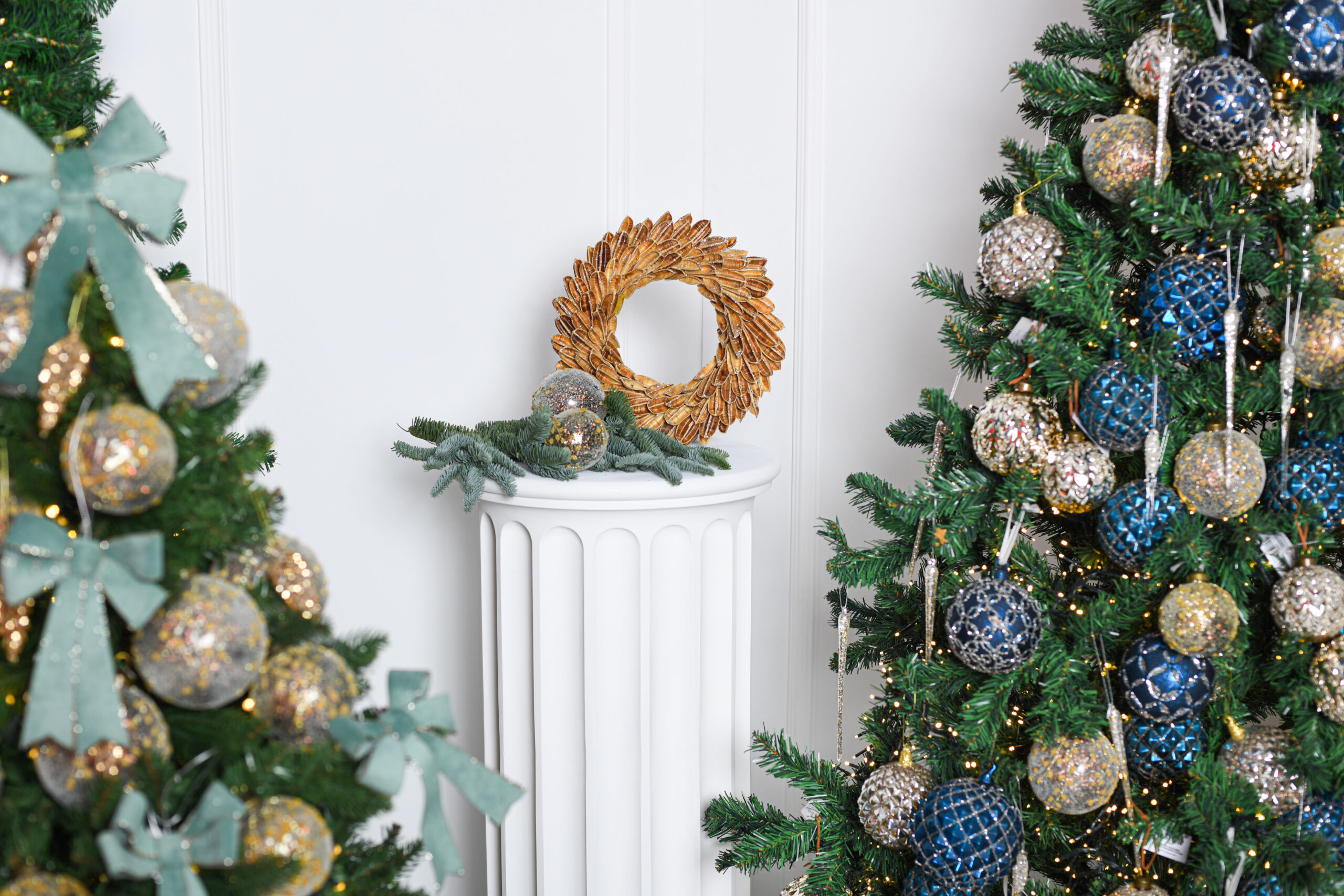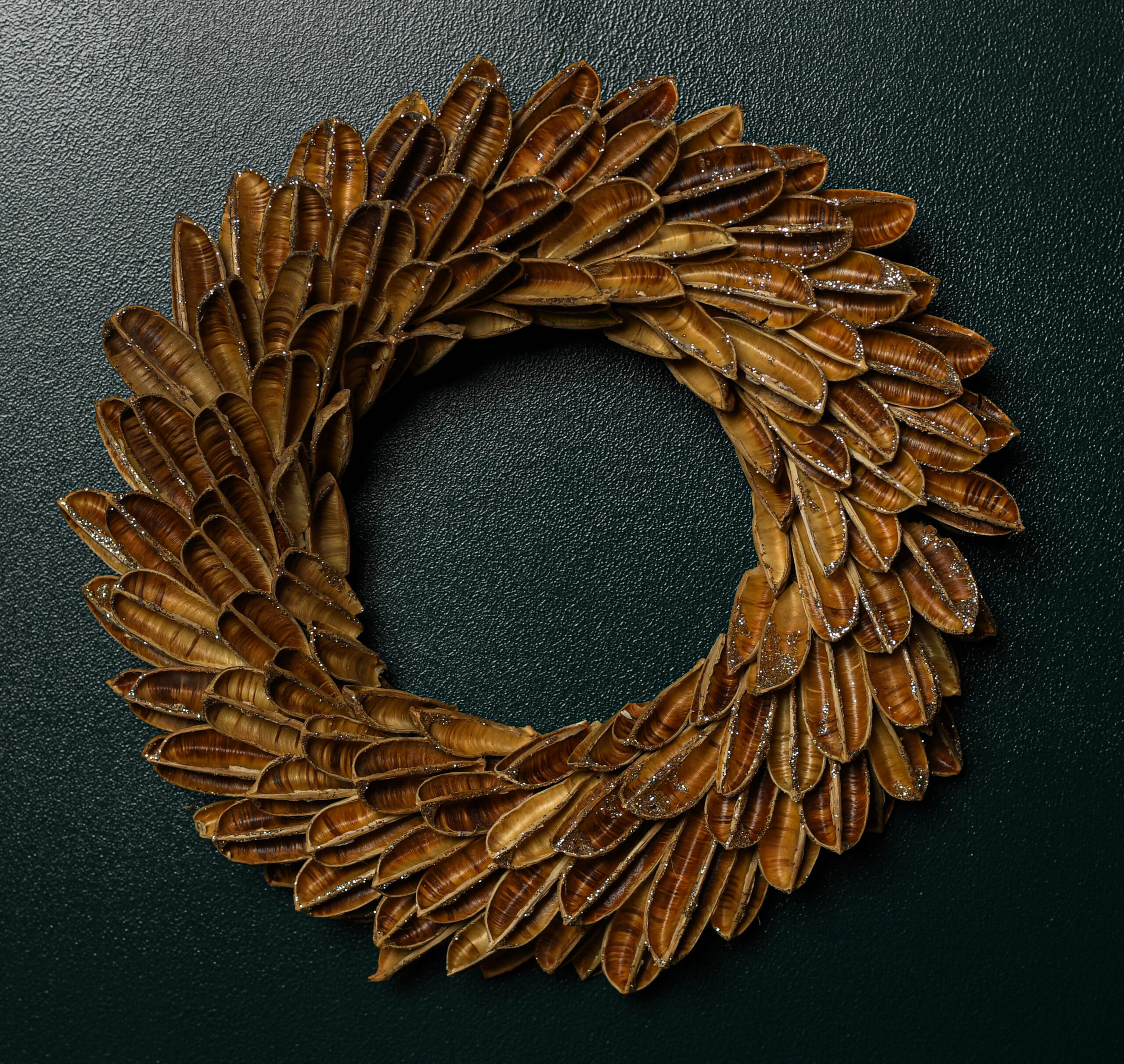 Kitoks vainikas – kitokių Kalėdų belaukiant. Auksiniu blizgučiu padengtos ankštys, subtiliam grožiui sukurti.