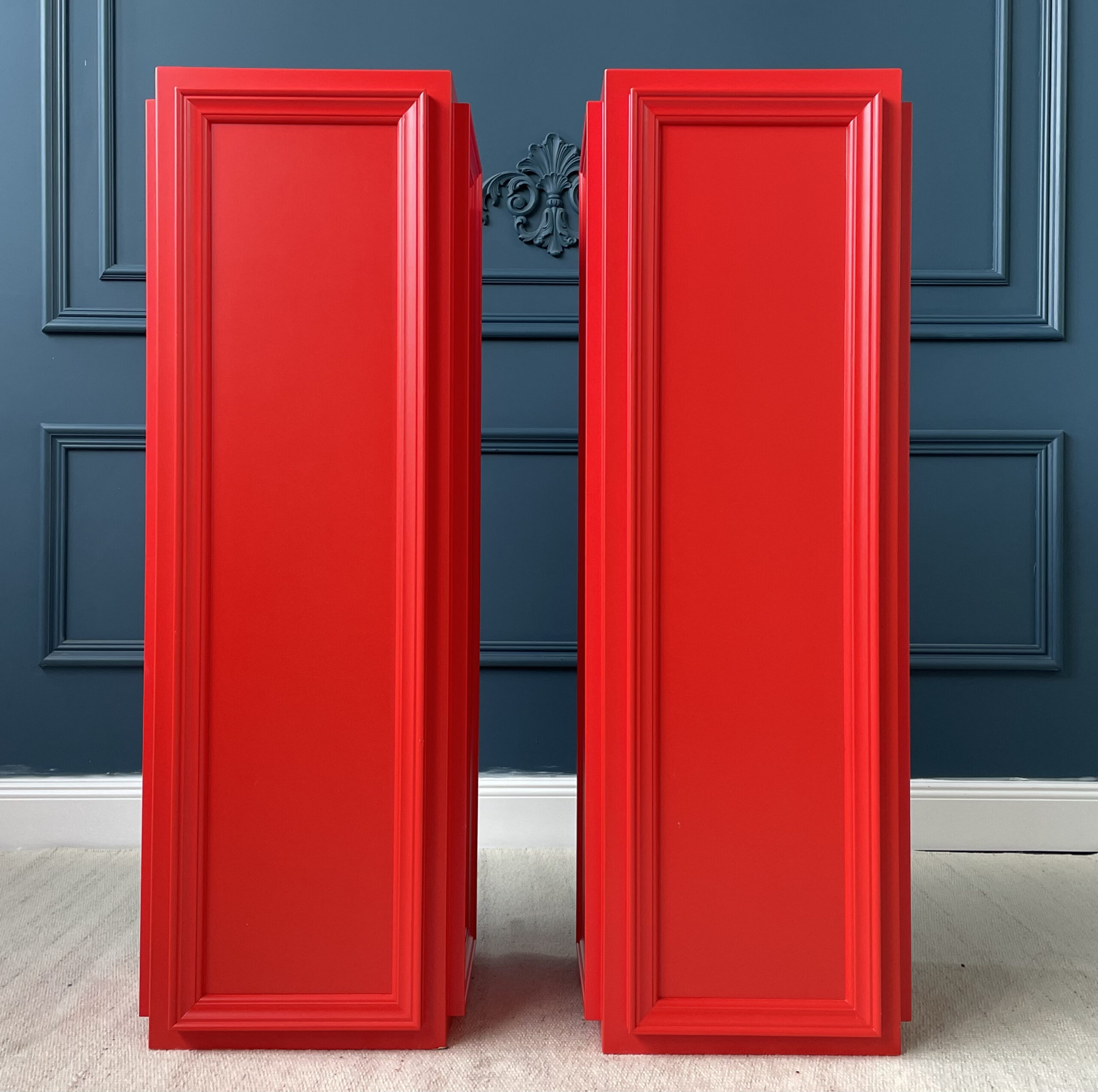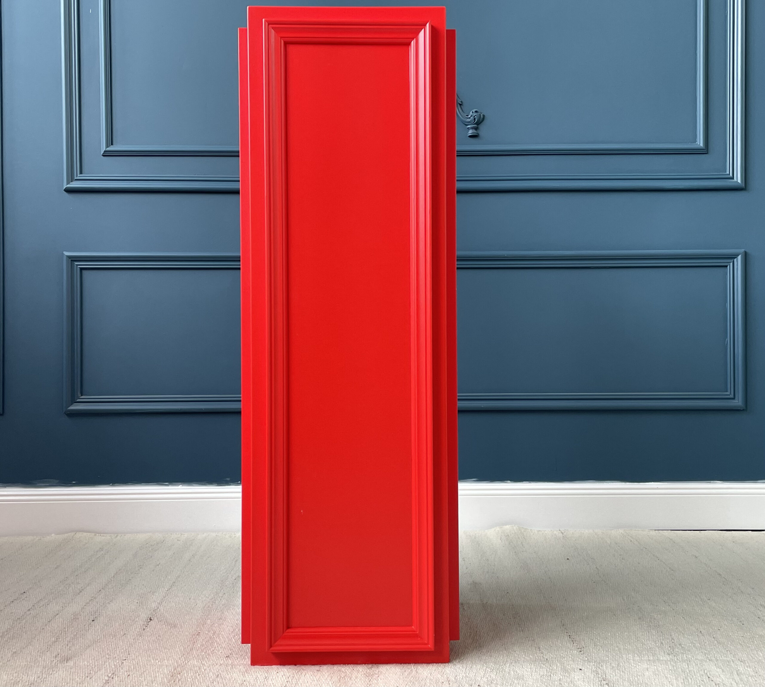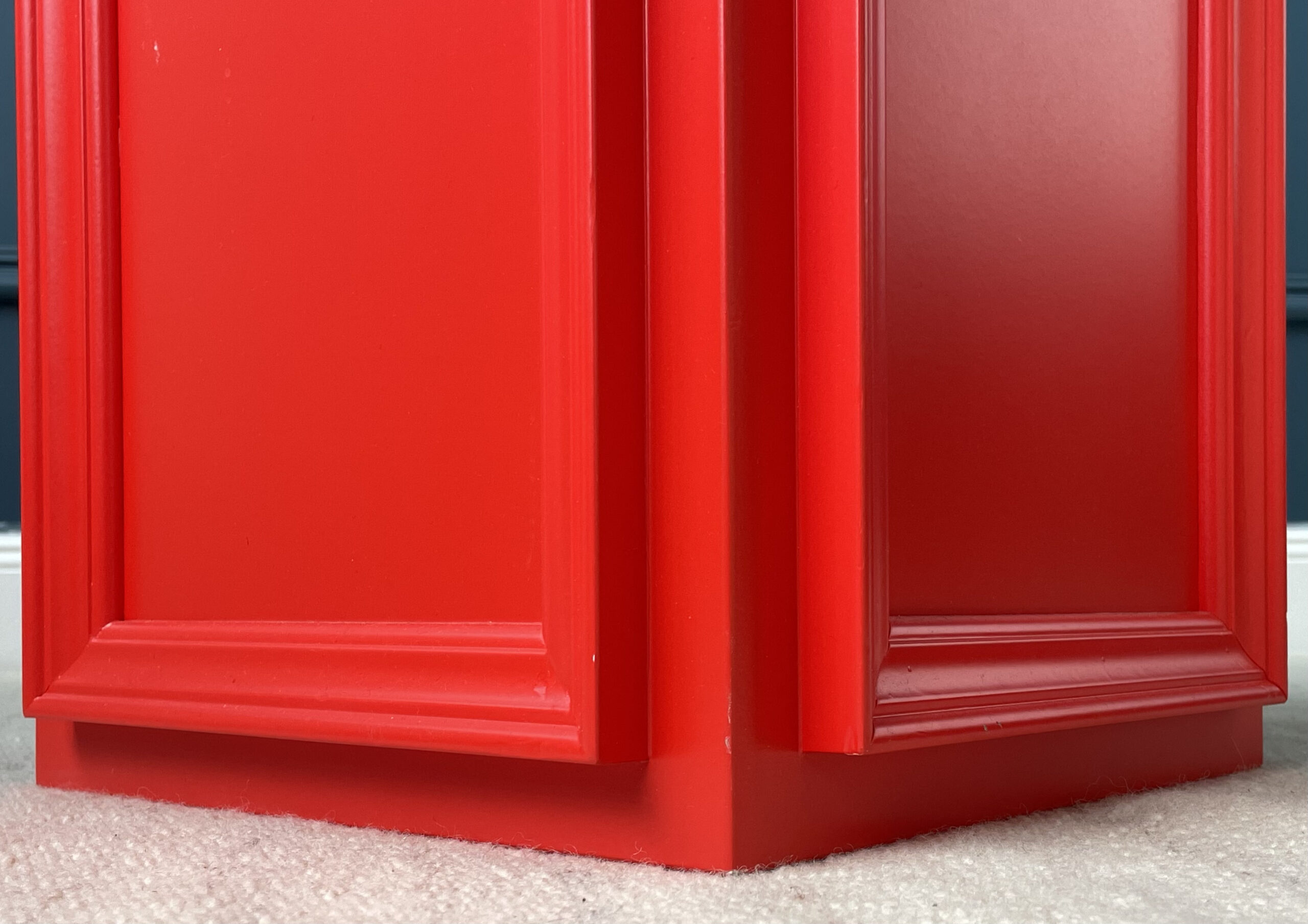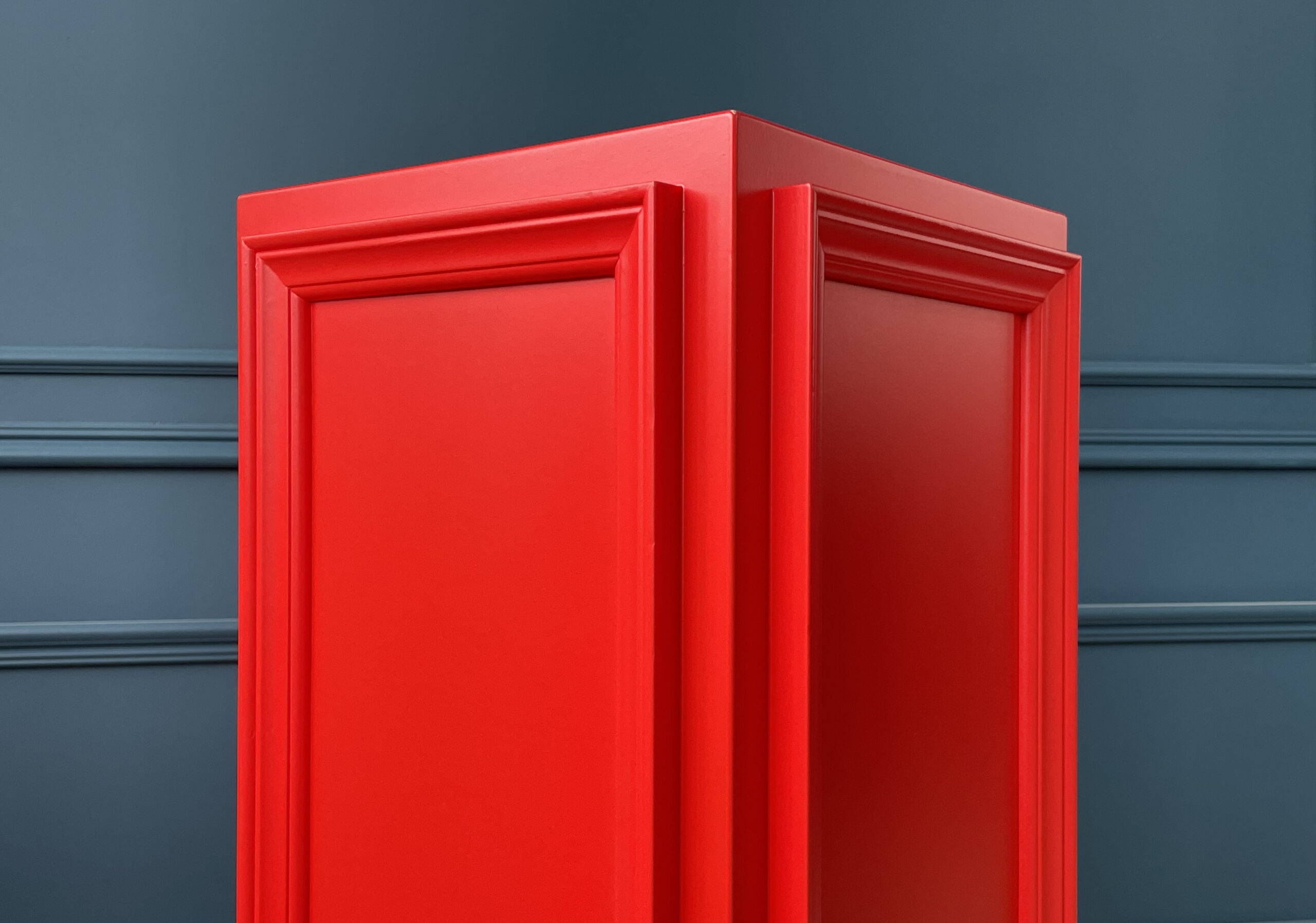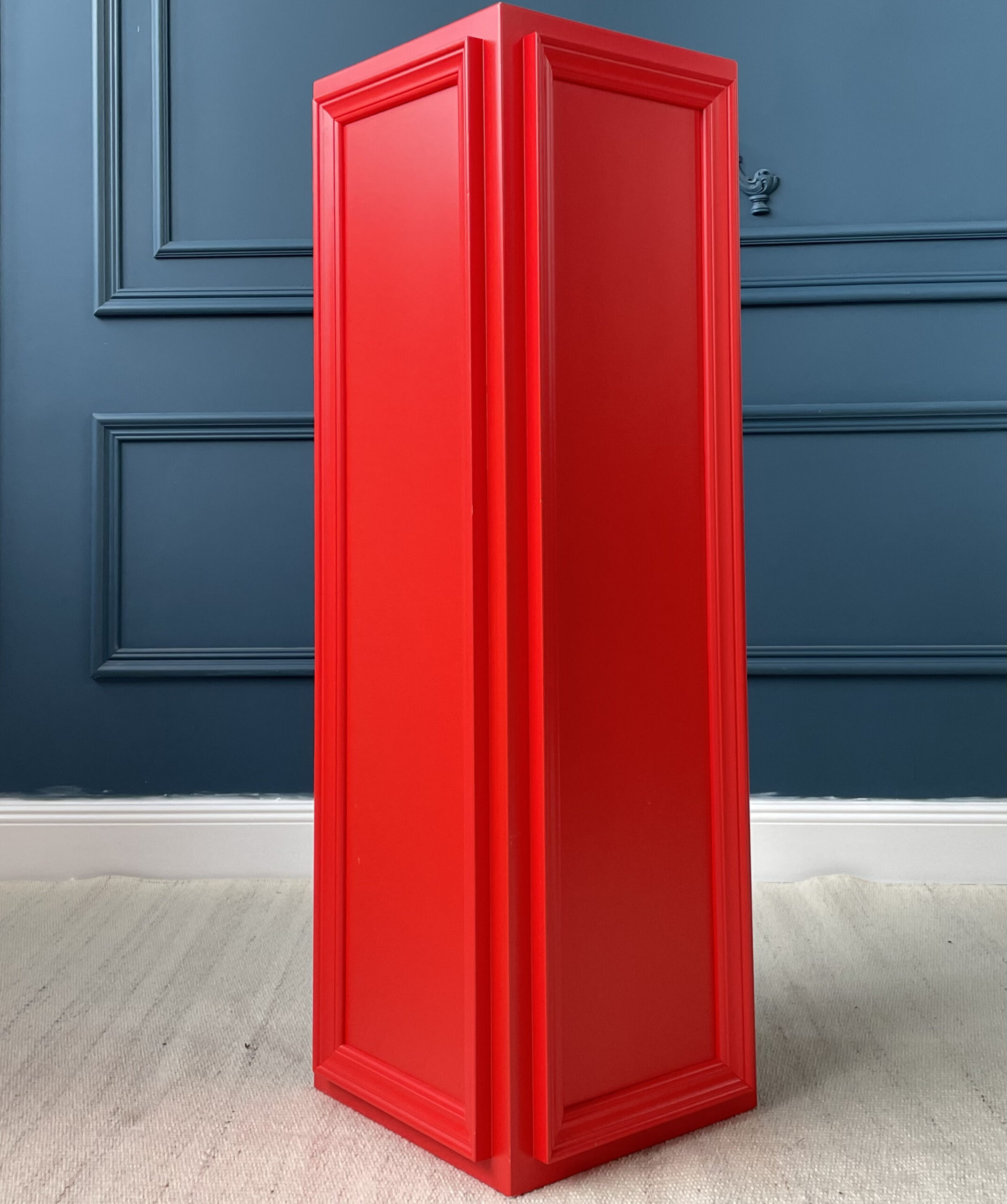 Medinė kolona, nudažyta raudona spalva. Kolonos viršus kvadratinės formos, sienos turi dekoratyvinius apvadus.