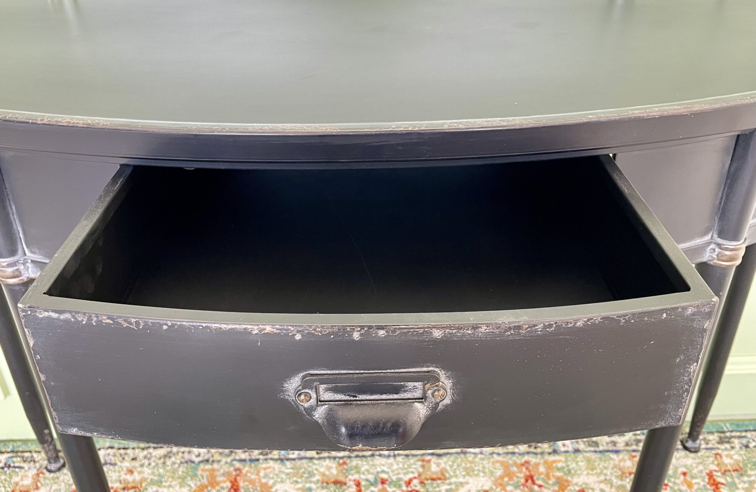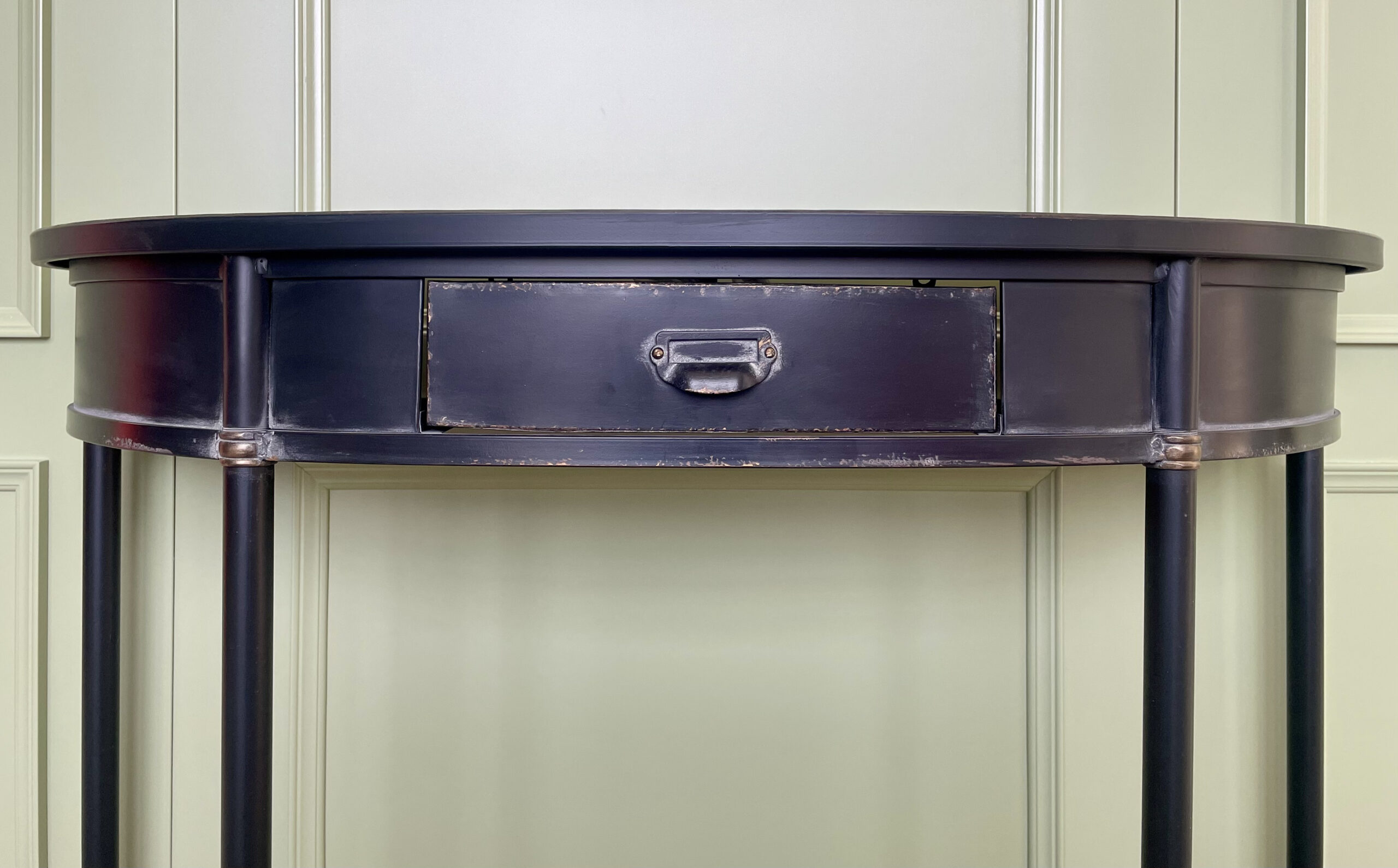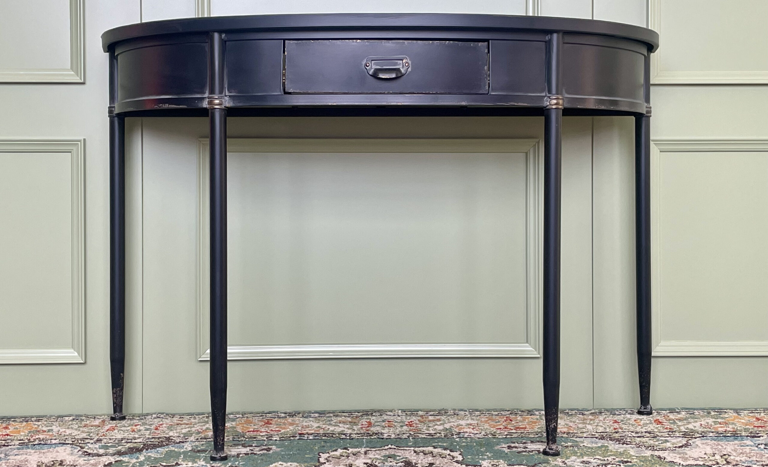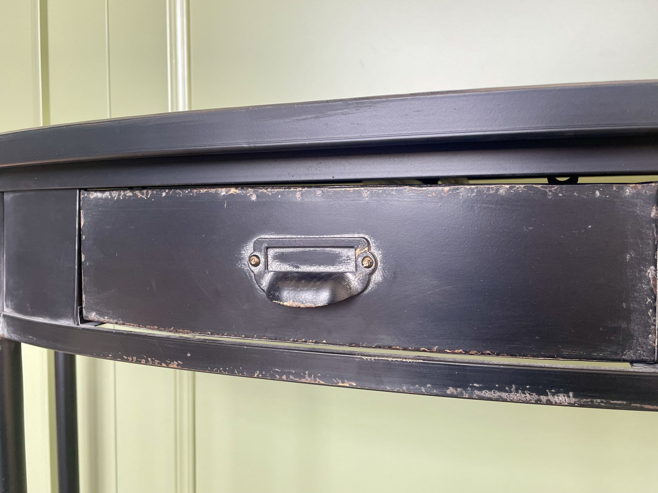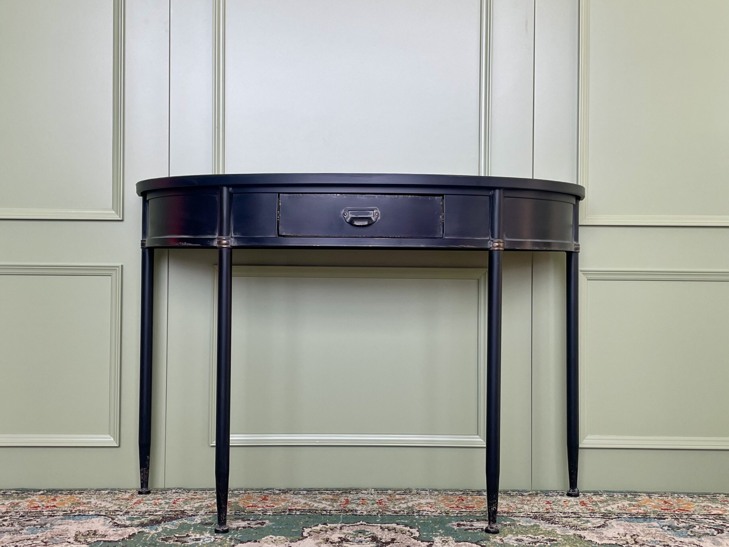 Metalinė vintažinė konsolė su atsidarančiu stalčiumi. Padaryta iš patvaraus metalo, nudažyto juoda spalva.