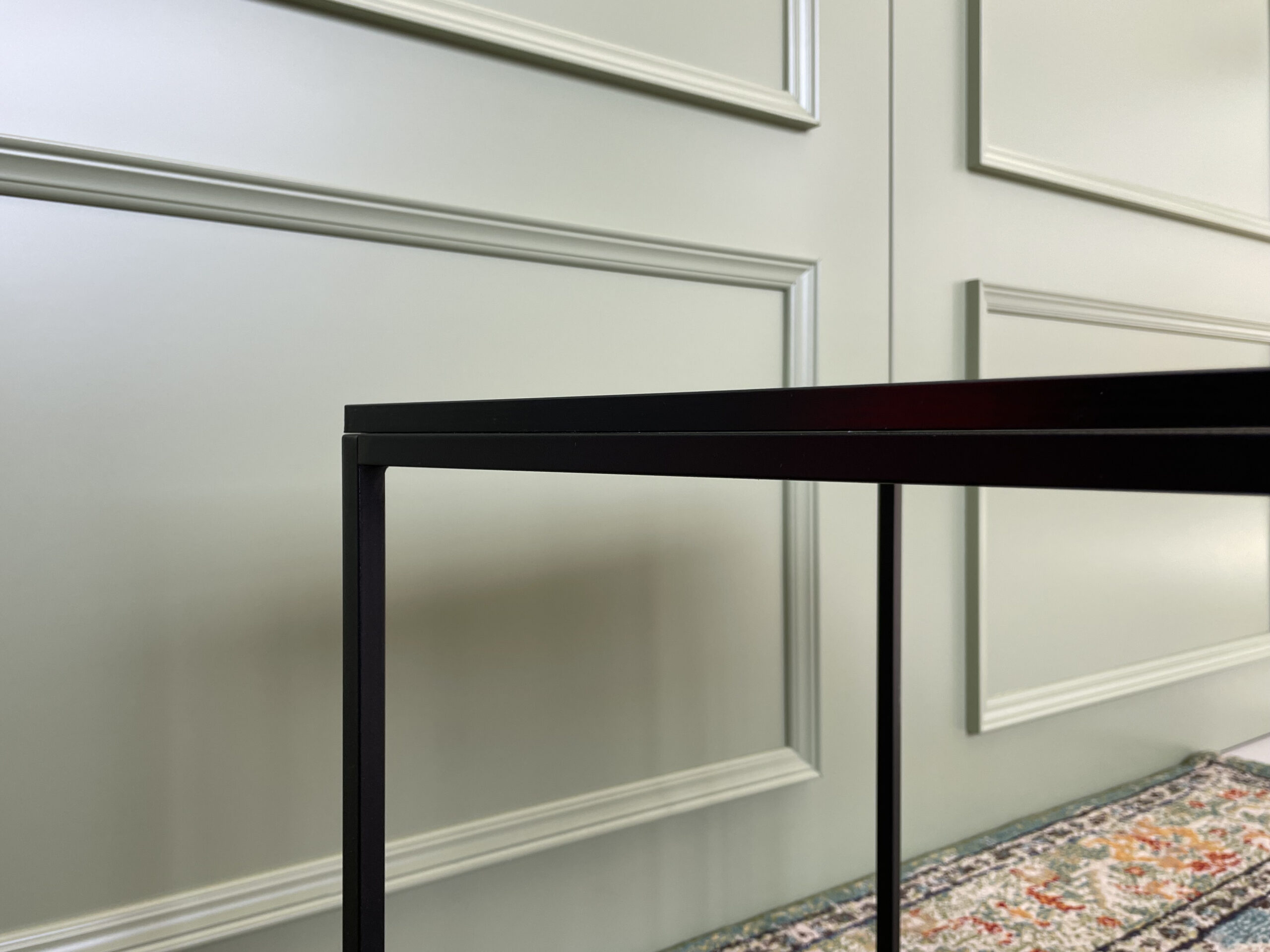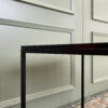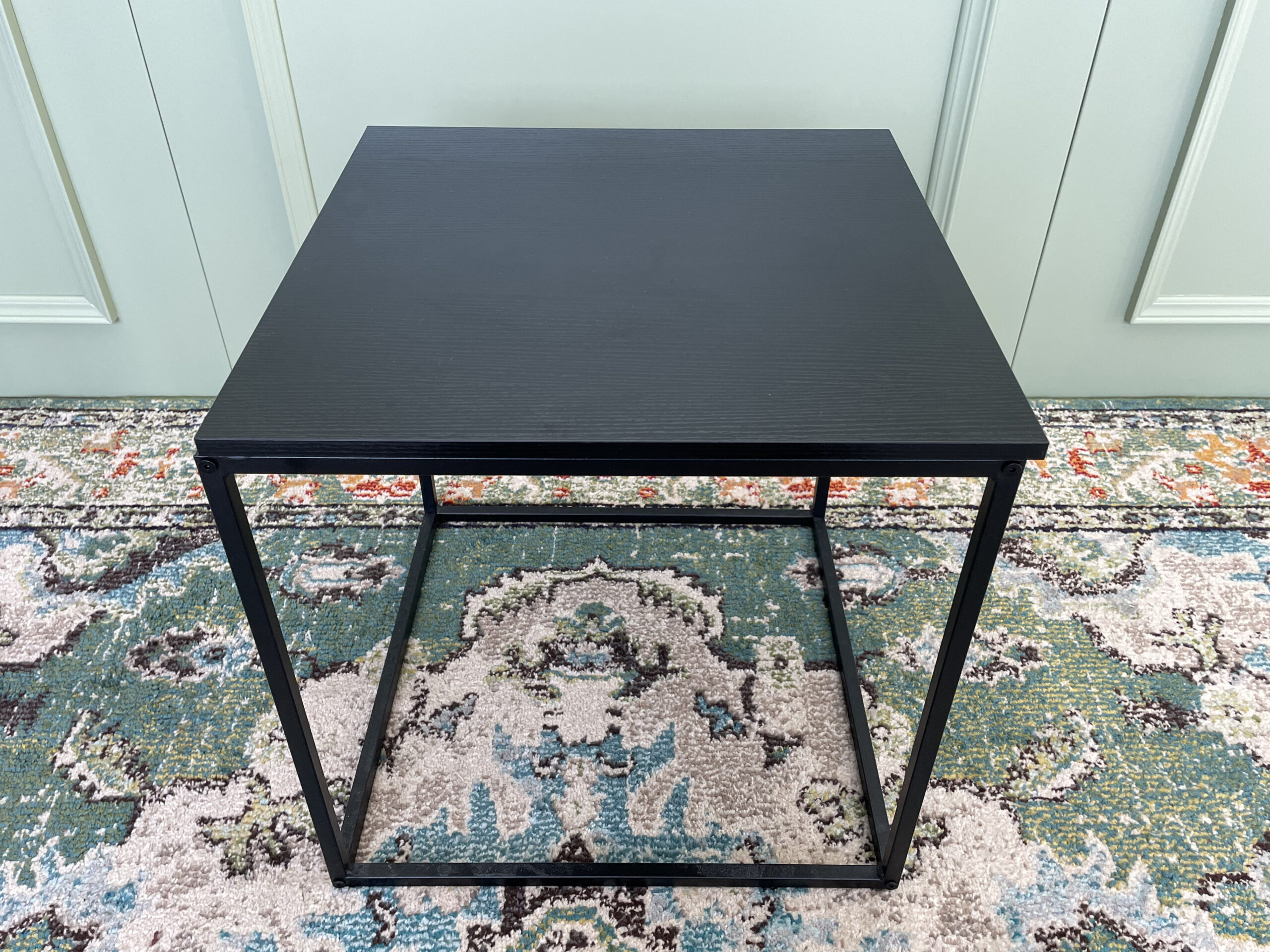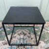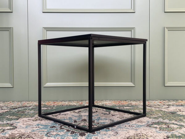 Kvadrato formos juodas staliukas. Rėmai sudaryti iš metalo, stalviršis iš medienos. Stabilus ir lengvas transportuoti.