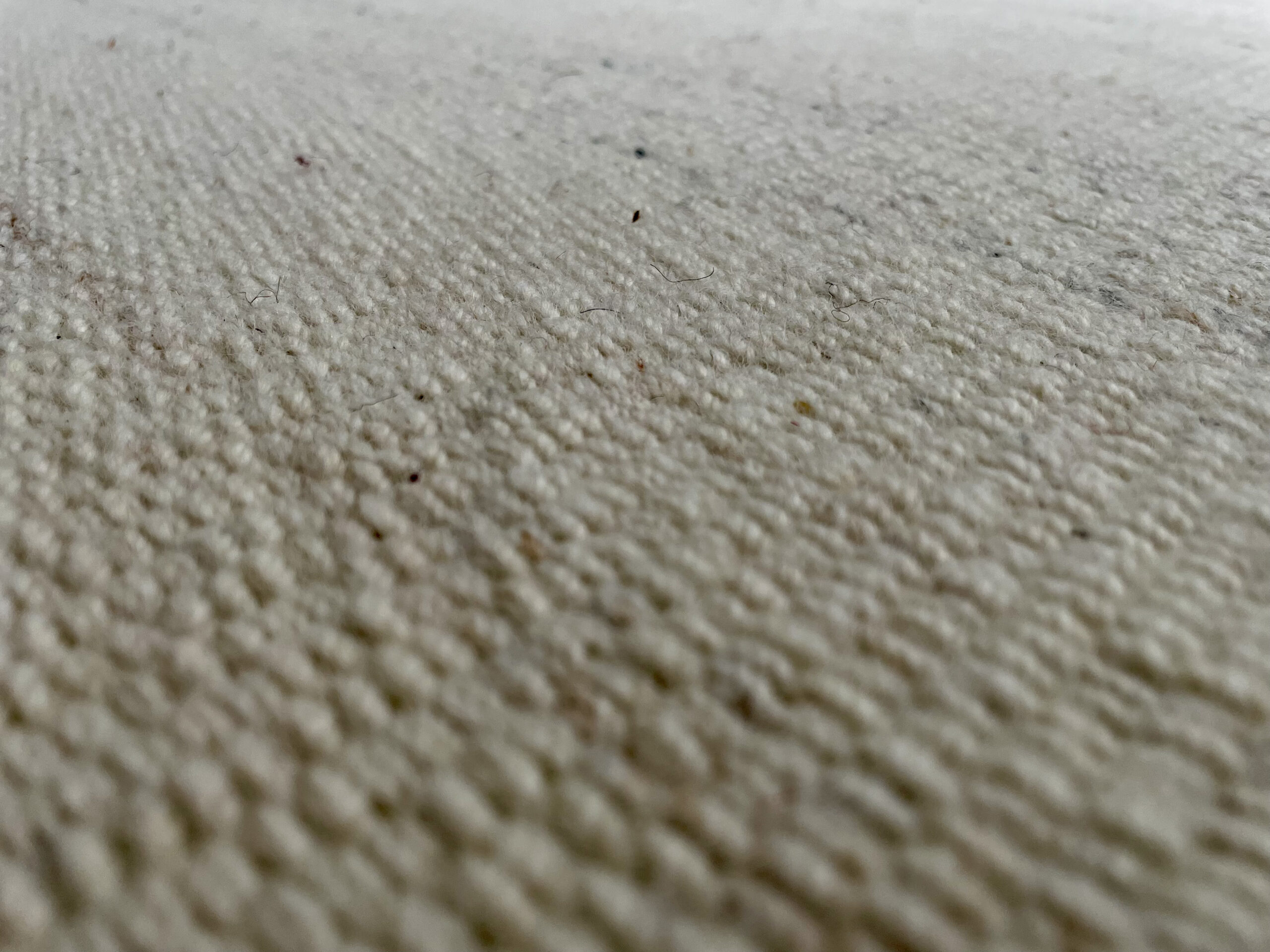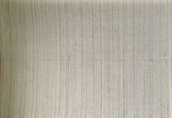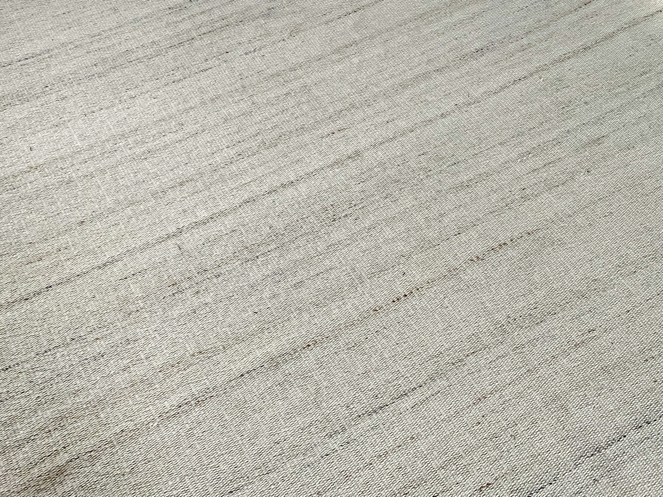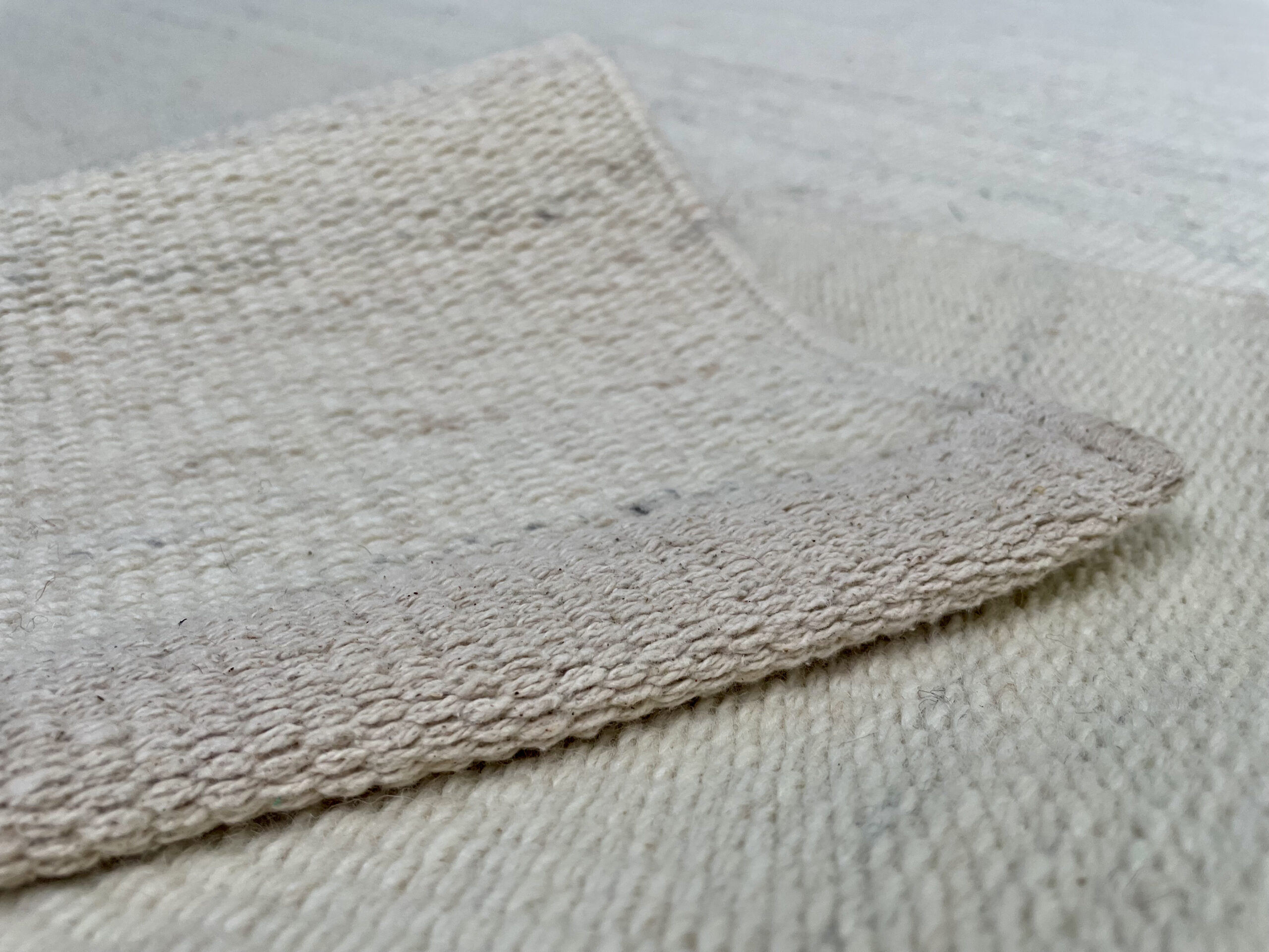 Megztas kilimas, iš balto audinio. Minkštas, boho stiliaus kilimas.