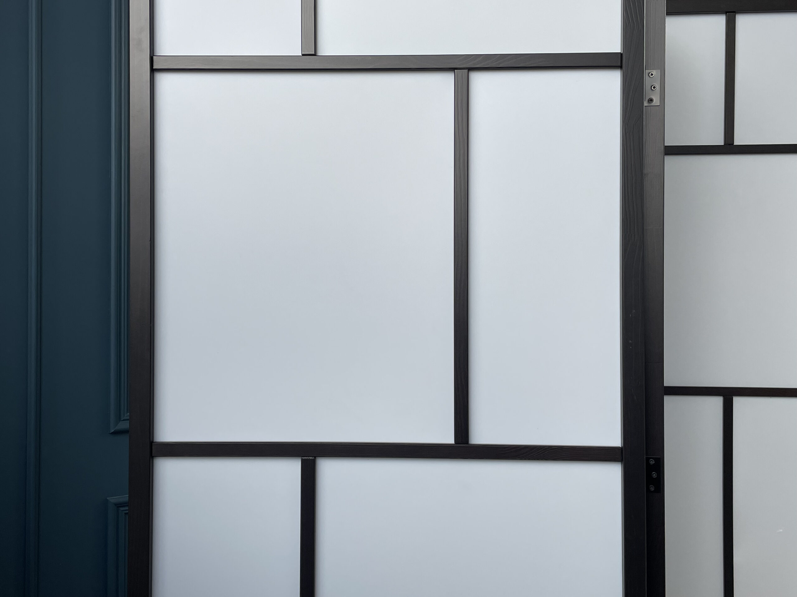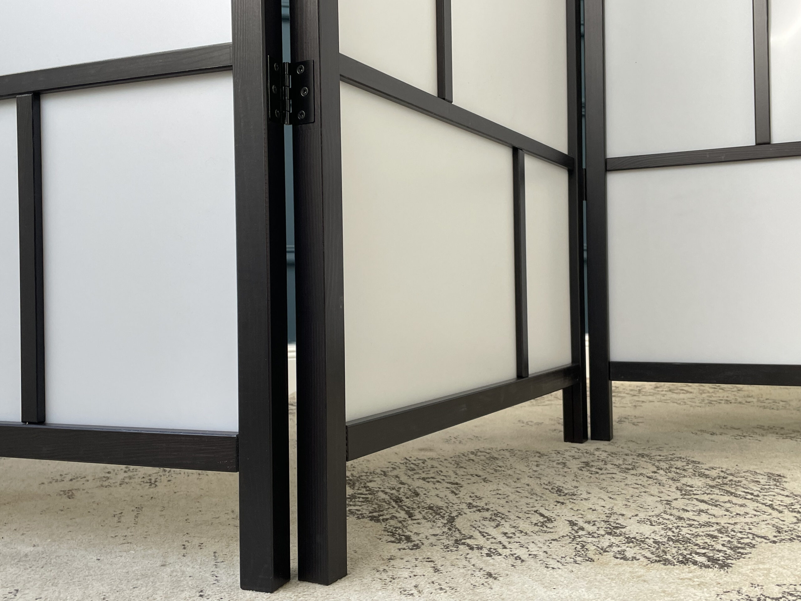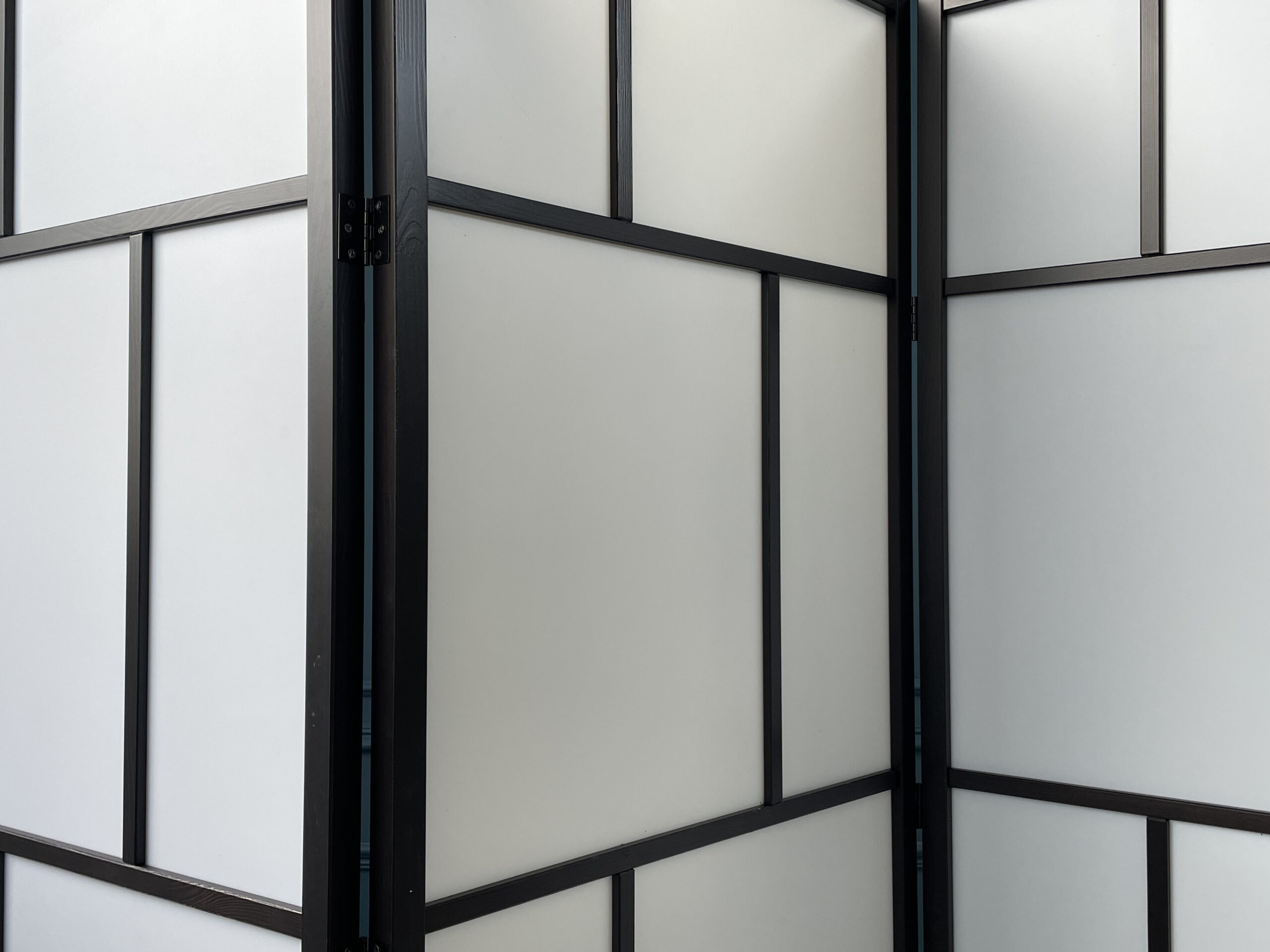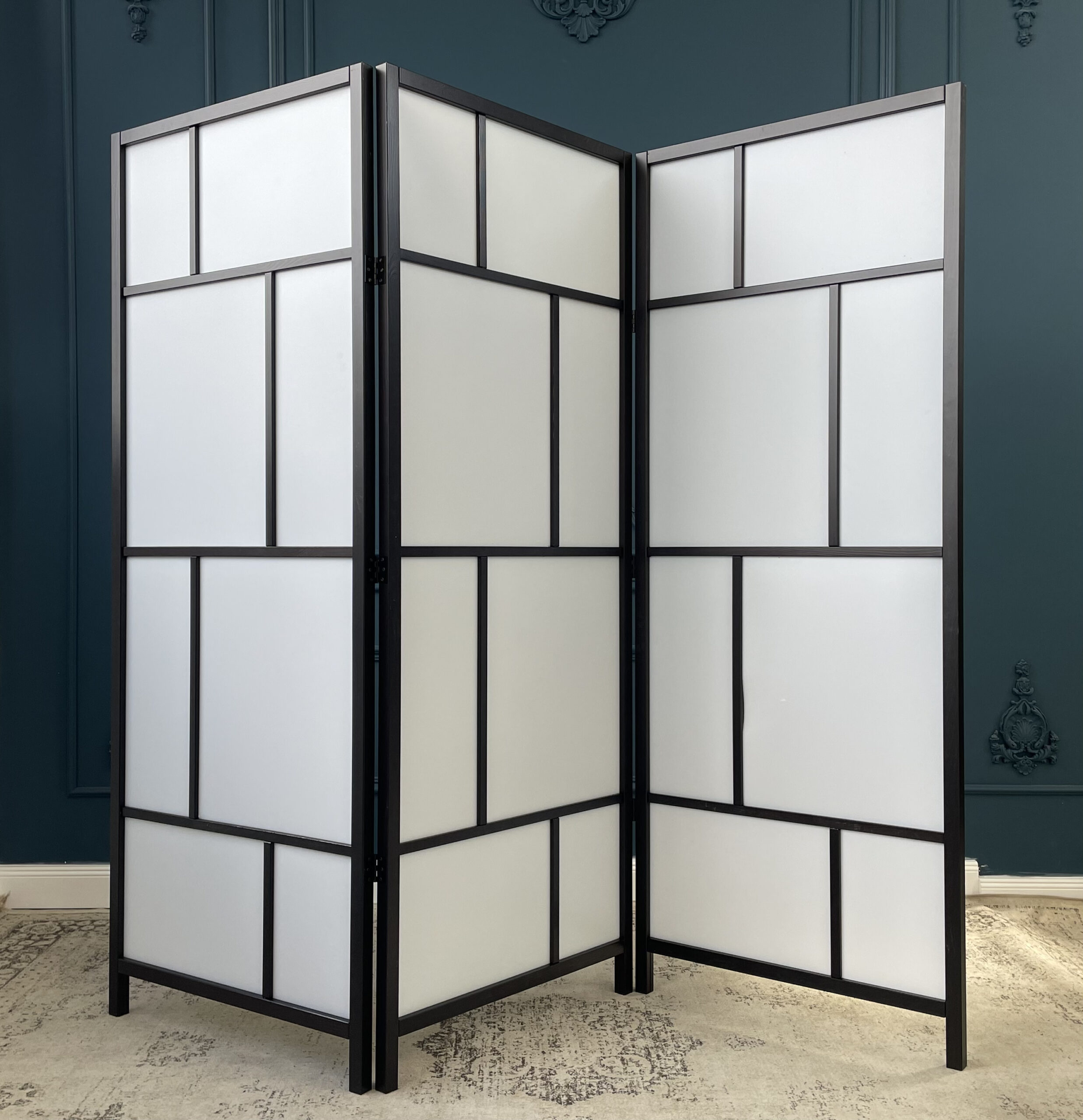 Iš juodos medienos pagaminta trijų dalių sulankstoma širma. Modernaus stiliaus, stačiakampio formos.