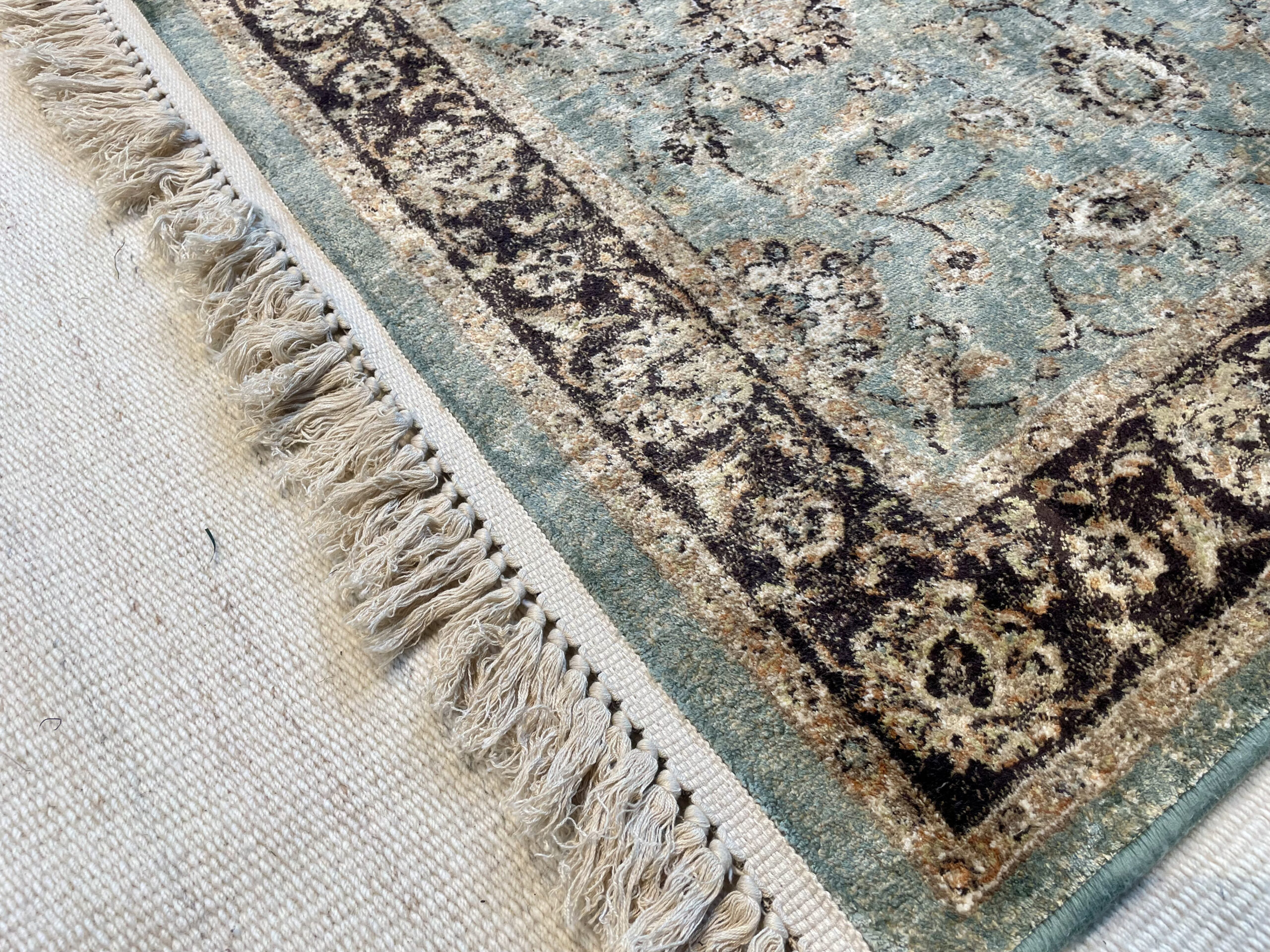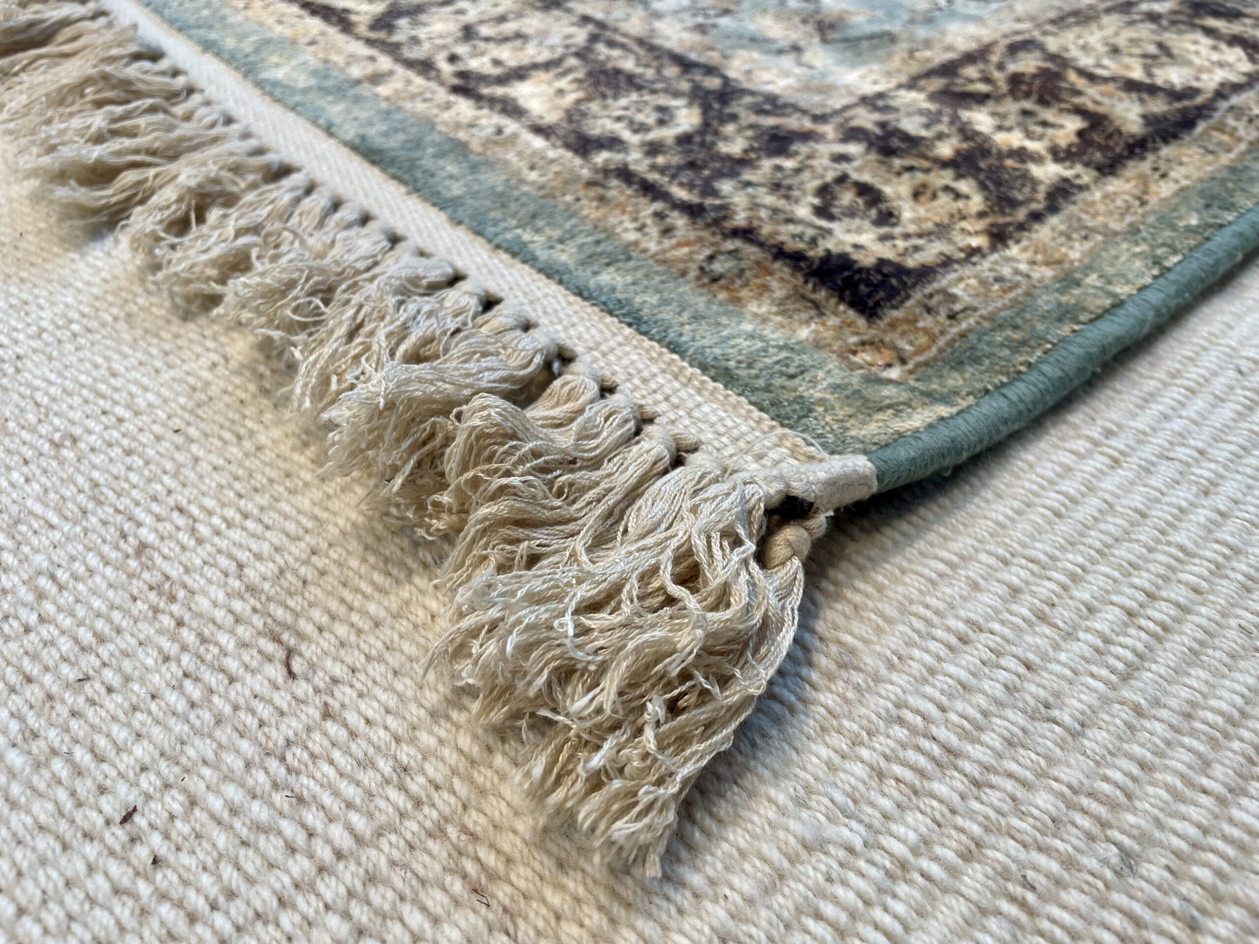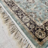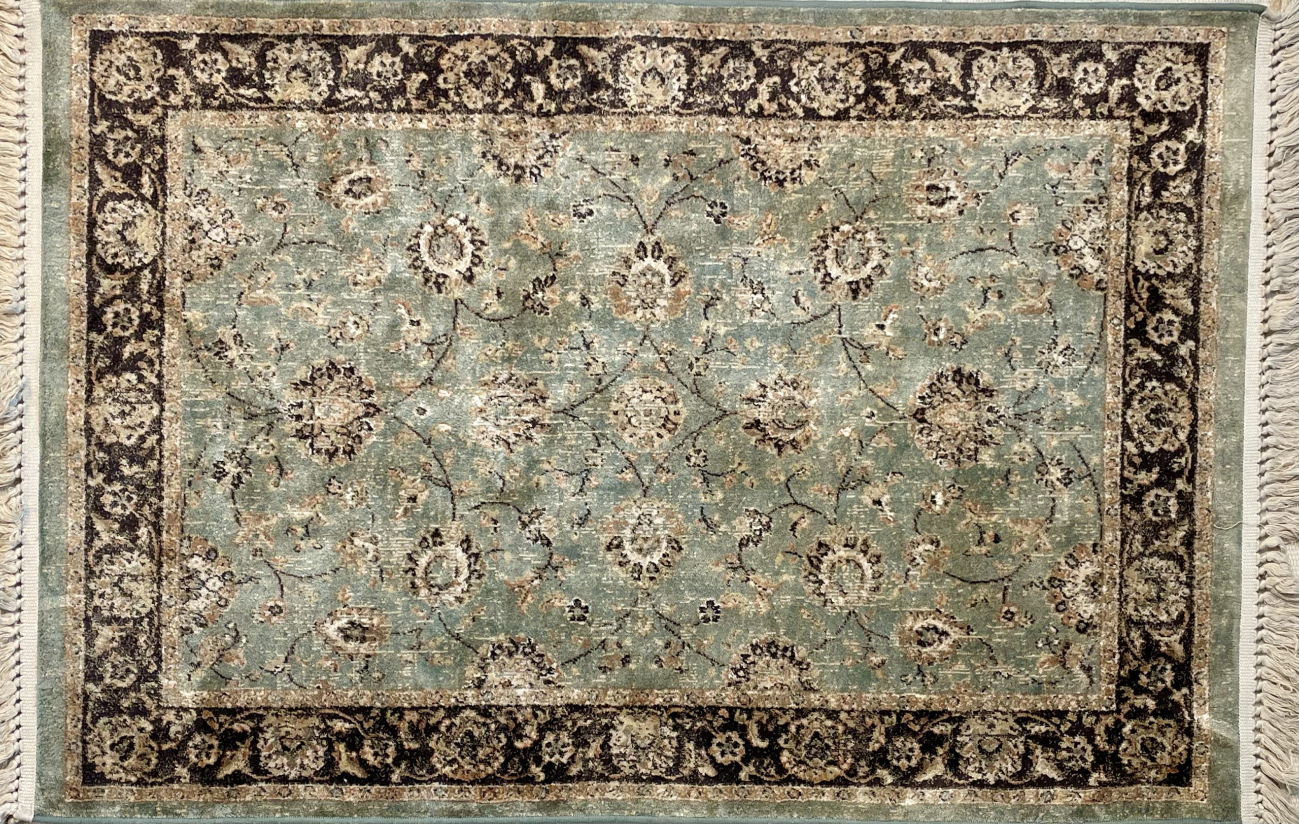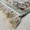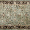 Žalsvas, sendinto stiliaus kilimas. Kilimas turi baltus kutus.